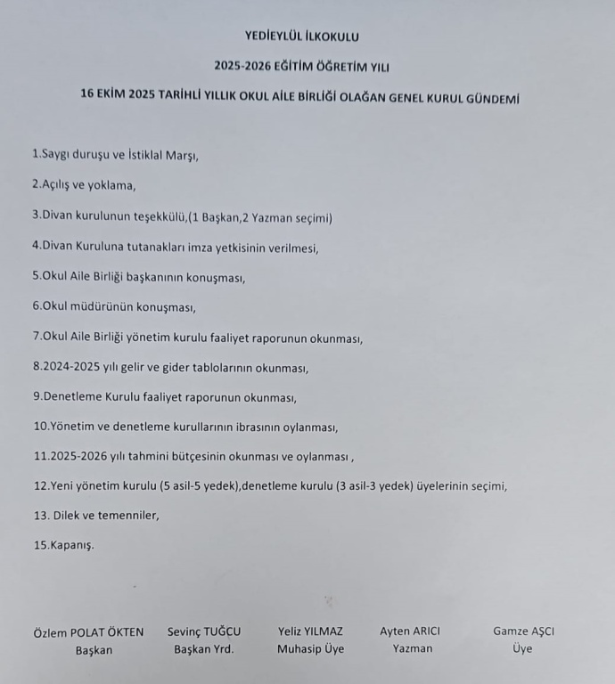 Okul Aile Birliği Olağan Genel Kurulumuz 16 Ekim saat 13.15'te aşağıdaki gündem maddeleri ile konferans salonunda yapılacaktır. Okul Aile Birliği Yönetim Kuruluna girmek isteyen velilerimiz 5 asil 5 yedek üye olmak üzere 10 kişilik ekiplerini oluşturarak 14 Ekim'e kadar dilekçelerini okul idaresine teslim etmeleri gerekmektedir. Bireysel başvuru alınmayacaktır. Çarşaf listeler oylamaya sunulacaktır.